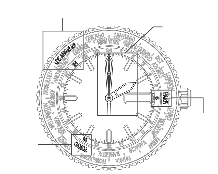 En utilisant les noms des principales villes du monde figurant sur la lunette rotative et l’affichage 24 heures sur les cadrans, il est possible de lire l’heure approximative dans chaque ville.