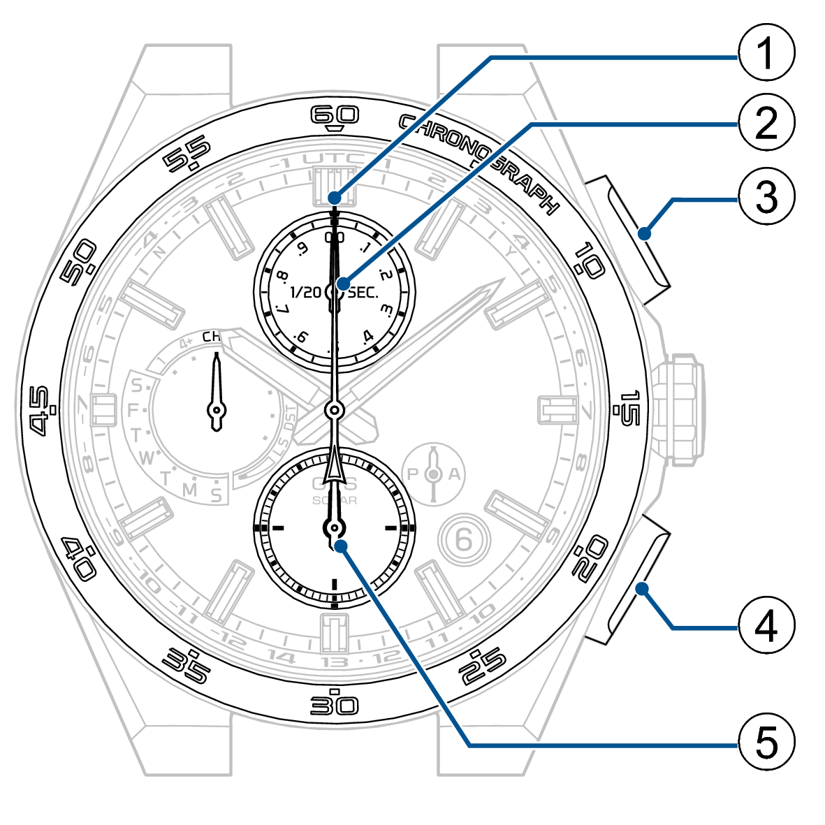 يتوقف عقرب ساعة الإيقاف 1/20 ثانية عند موضع 0 ثانية بعد التشغيل لمدة تصل إلى دقيقة واحدة.