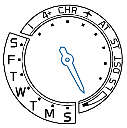 Continuare a caricare l’orologio finché la lancetta indicatrice multifunzione ritorna alla visualizzazione del giorno della settimana affinché l’orologio sia in grado di funzionare continuamente e ricevere i segnali GPS. |