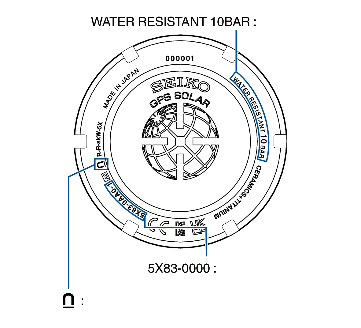 腕表后盖上刻有手表的机型和性能 防水功能 机芯号/壳号 抗磁功能 上图只是一个示例,因此显示的位置和内容可能与您的手表不完全相同。 防水功能 请参阅防水功能 机芯号/壳号 表示手表型号的编号。 抗磁功能 请参阅抗磁功能