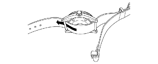 Legen Sie das Band wie abgebildet neben die Uhr, wobei sich die Schließe auf der 12-Uhr-Seite befindet. Führen Sie dann das Bandende von oben zwischen dem Gehäuse und dem Federsteg durch.