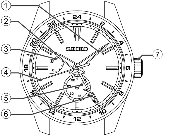 分針 時針 パワーリザーブ表示針 秒針 日針 24時針 りゅうず 0段目(ロックを外した状態):ぜんまい巻き上げ(手巻) 1段目:日付合わせ・時差修正機能 2段目:時刻合わせ 表示の位置やデザインは、モデルによって異なる場合があります。 パワーリザーブ表示針の向きは異なる場合があります。