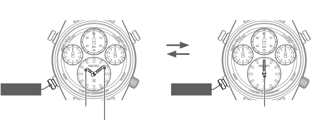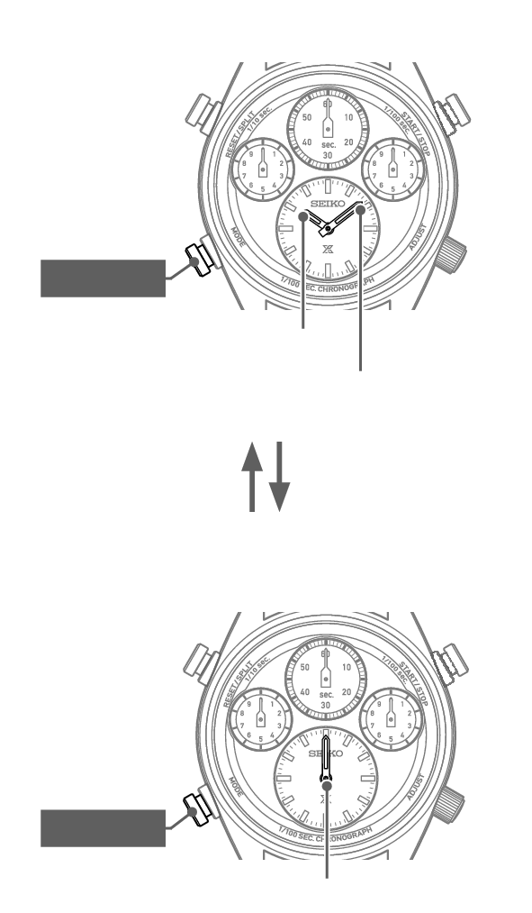 Beim Umschalten zwischen „Zeitanzeige“ und „Stoppuhr-Anzeige“ bewegen sich Stunden-, Minuten- und Stoppuhrzeiger.