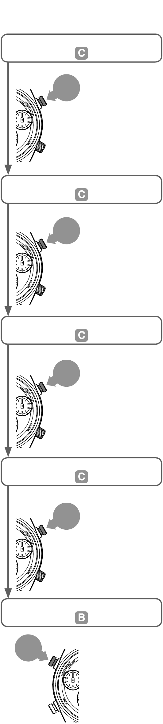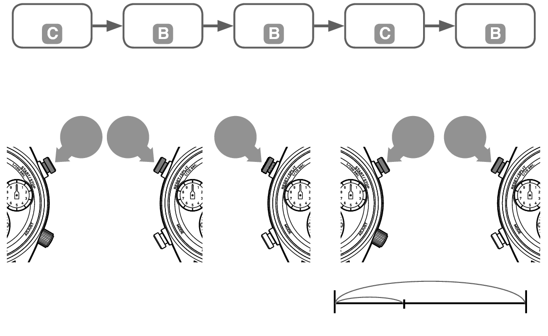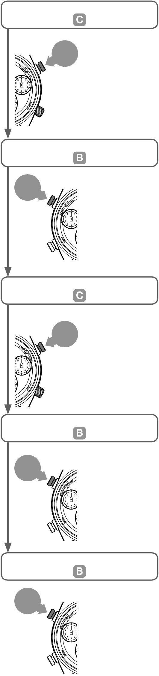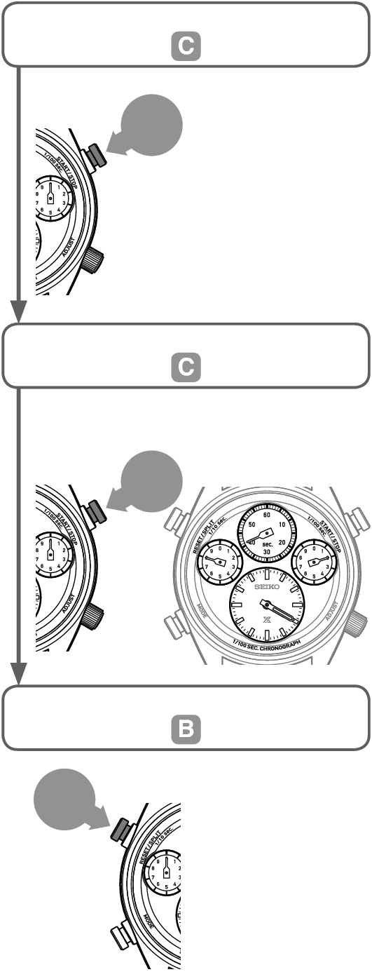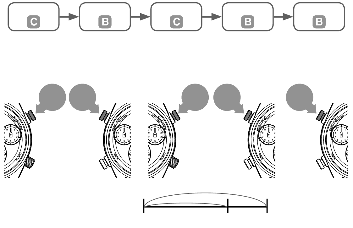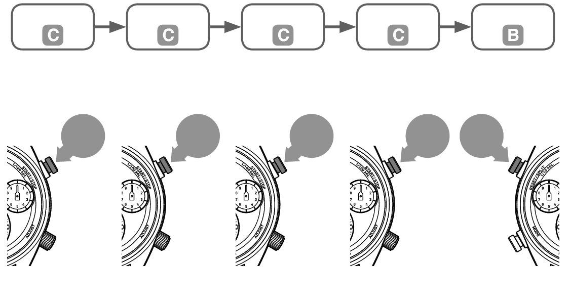 Wenn die Drücker betätigt werden, um die Stoppuhr anzuhalten oder eine Zwischenzeit zu messen, zeigt der Sekundenzeiger der Stoppuhr die gemessene Zeit ab dem Neustart an.