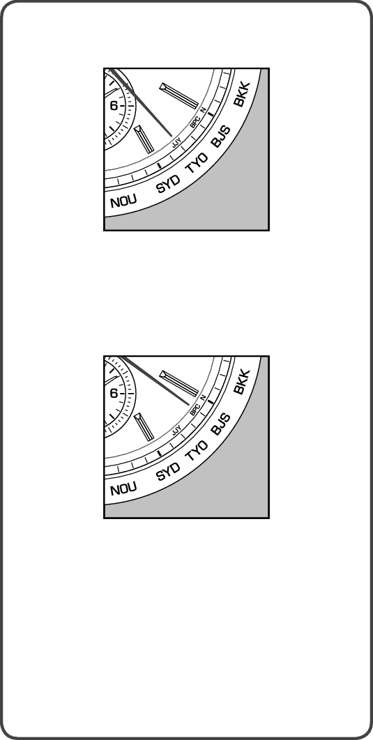 每按压按钮一次,则秒针走动一下,移动至邻近的时区。