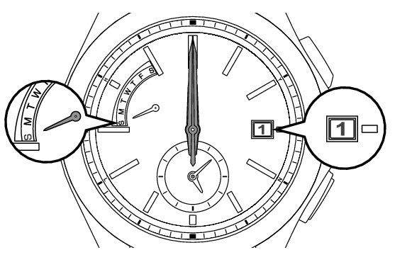 調整時,把“1”的數字對準日期顯示窗的中心位置。