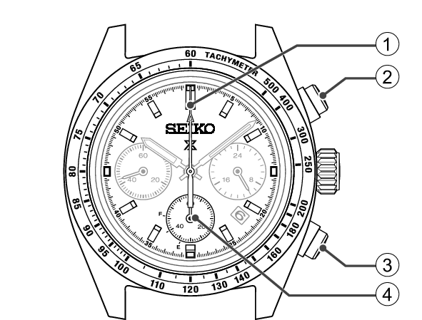 O cronógrafo mede até 60 minutos em incrementos de 1/5 de segundo. Quando a medição atinge 60 minutos, os ponteiros do cronógrafo param automaticamente na segunda posição dos 0 minutos e 0 segundos.
