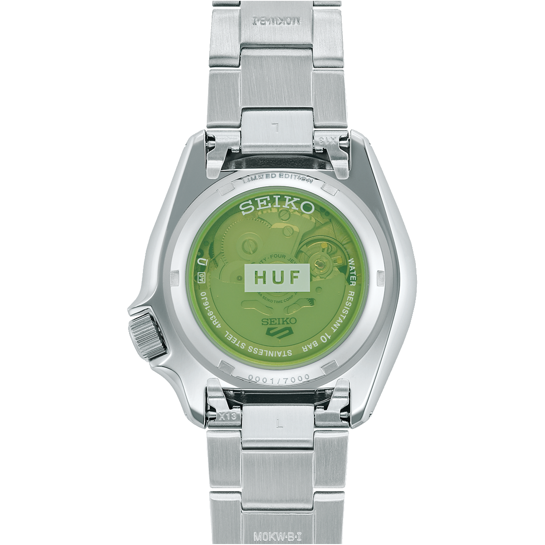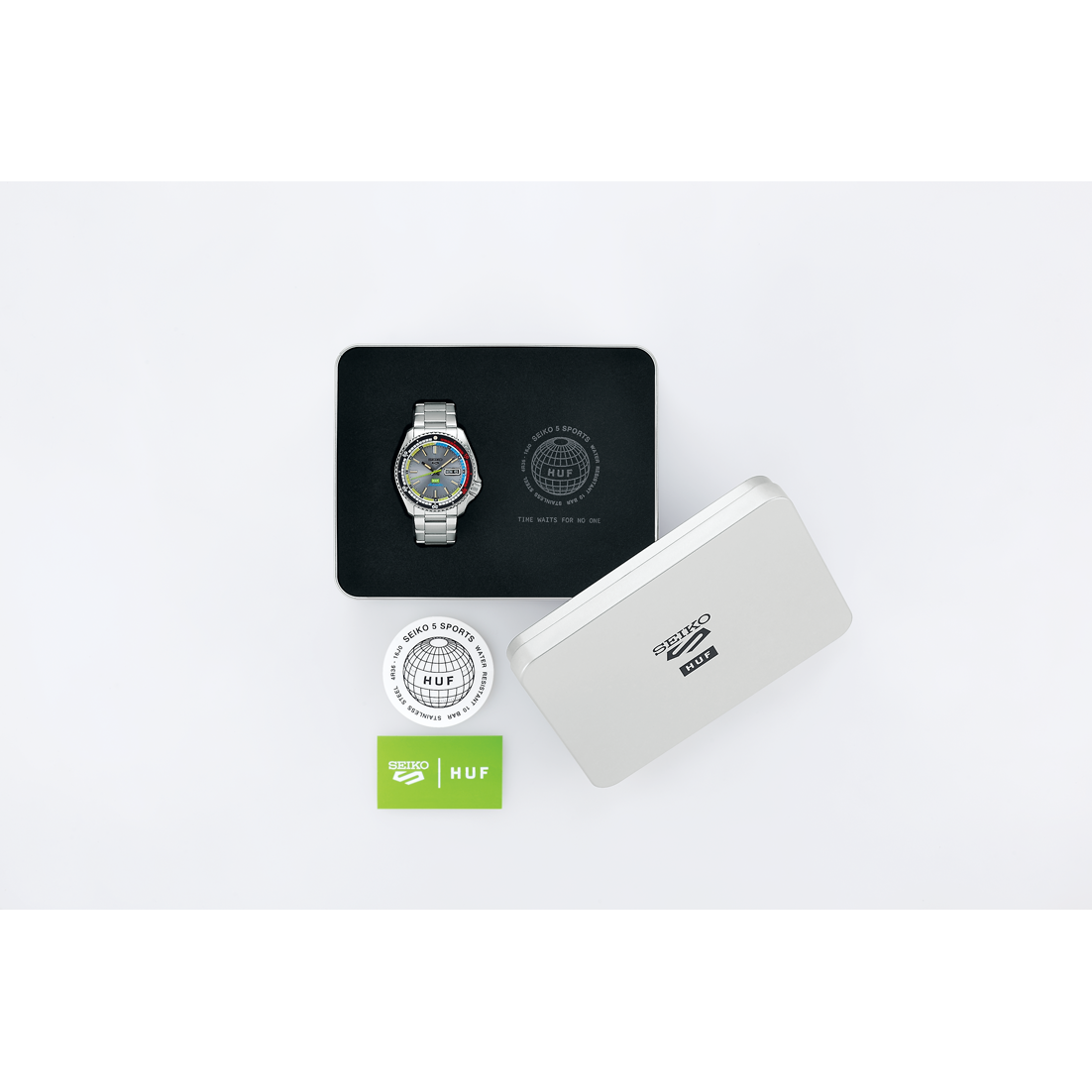 Ispirato a un design tradizionale di Seiko 5 Sports che ha raggiunto la popolarità alla fine degli anni '60, l'orologio è dotato di una combinazione di colori fornita da HUF.