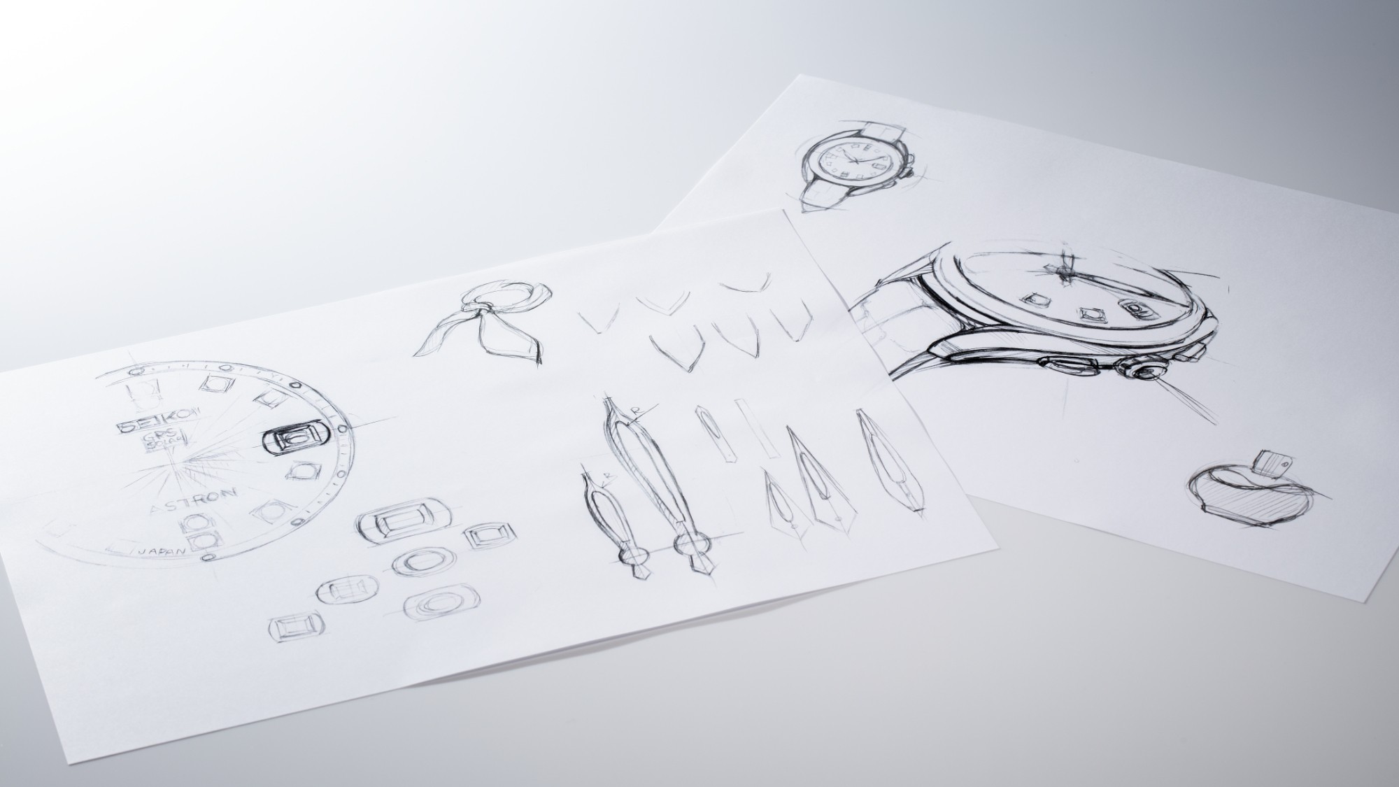 The sliver white of the dial is more brilliant than the pure white of the 8X series. Even the hi-gloss hour markers have the look and feel of total quality. “To create a three-dimensional look, we intentionally placed the hour markers at an angle instead of making them level with the dial. Controlling the angle of placement for something this small is more difficult than it looks.” The ring antenna was eliminated so that the space between the dial and crystal no longer differed from an ordinary wristwatch. Instead, the designer was tasked with the new challenge of balancing the universal beauty of a wristwatch with the identity of Seiko Astron. The outline, with the cushion-shaped case and single-radius case side, echoes the original Quartz Astron of 1969. “As we developed the 5X series, we decided to once again promote the uniqueness of the original Astron.”