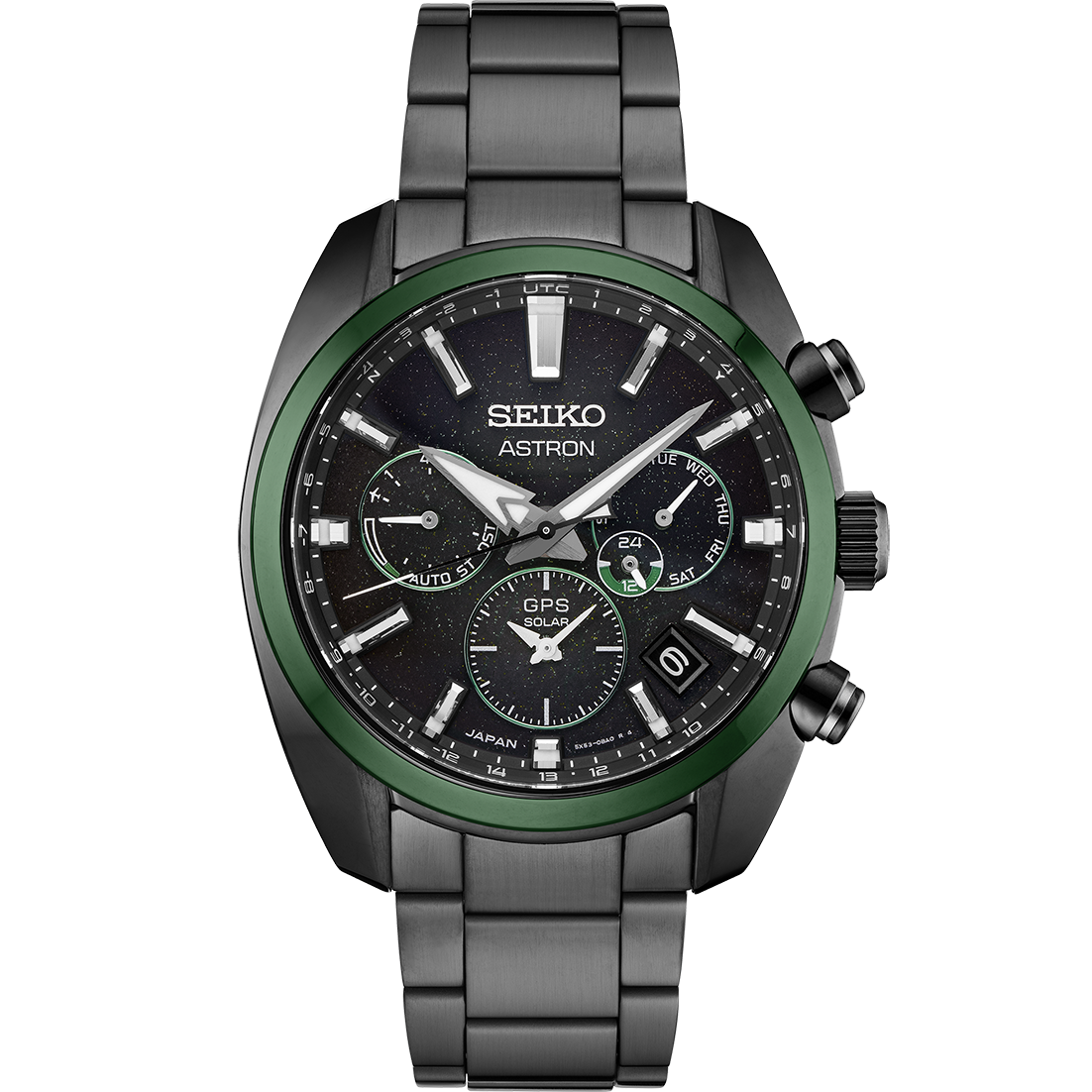 This watch features the increasingly popular green on black combination. Inspired by the nebulae of deep space, the dial has tiny specks of gold color. The bezel and sub dials are also highlighted in green. GPS Solar (Cal.5X53). Ceramic bezel with stainless steel case (dimensions 49.9 by 42.7 mm, thickness 13.5 mm). Water resistance 10 bar. Stainless steel bracelet.