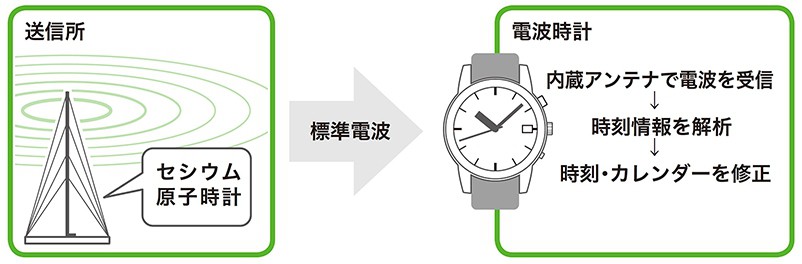 時計に内蔵されているアンテナが、送信所から送信される標準電波を受信し、時刻情報へ変換します。その時刻情報で、時計の時刻やカレンダーが修正されます。