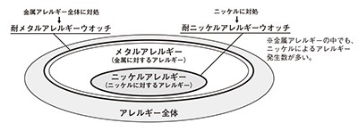 金属アレルギーの中でも発生数が多い、ニッケルに対するアレルギーに配慮した、耐ニッケルアレルギーウオッチ1モデルを同時に発売いたします。