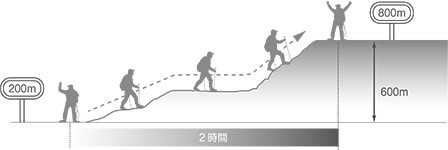 1時間あたりに移動する高度差(m/h)で、登山中のペースを表します。登高スピード(m/h)が分かると、目的地と現在地の高度差(m)から目的地までの所要時間を見積もることができ、自らの登山計画が順調か、計画を見直すべきかの判断基準となります。登高スピードは年齢・体力・キャリアなどにより異なるため、自分自身の適切な登高スピードを認識することで、登山時のオーバーペース防止に役立ちます。