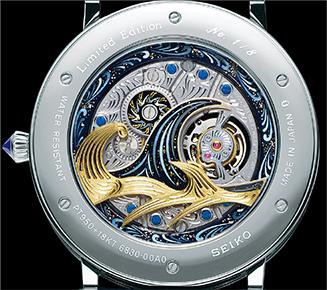 ひときわ目をひく6時側の波には、大変緻密な螺鈿技法が施され、波の動きをイメージして紫から黄緑の繊 細なカラーグラデーションに仕上げています。極小の貝を美しいグラデーションになるよう配置し研ぎだすのは、 世界的に評価の高い漆芸家・田村一舟氏ならではの技術で、まさに日本の匠の技の融合によって実現した、彫金と螺鈿の美しいハーモニーを楽しむことができるモデルです。