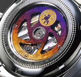 シースルー仕様の裏ぶたから見ることのできる回転錘には、軽量なチタン素材を採用するとともに美しい多色のグラデーション仕上げを施しています。これは闇を切り拓いて暁の光が昇っていく様をグラデーションで表現した陽極酸化処理ならではの特別な仕様であり、塗装でもめっきでもない、素材そのものの豊かな色味です。また、今回の回転錘に採用するチタン材は高弾性、高い振動吸収性を備えており、衝撃による変形、ムーブメントや回転錘のベアリングへの衝撃の伝播を軽減することで、より安心してご使用いただける実用性も兼ね備えています。
