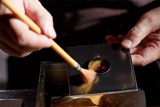 日本の美意識を体現する本作には、その表現手法として、「金属のダイヤルに敷かれる黒漆」「独特の飴色を生む白檀塗」「優美な金色の蒔絵」と3種におよぶ漆芸を採用しています。 かねてより、プレザージュで採用されている漆黒のダイヤルは、金属と漆を直接結びつける革新的な製造手法と、平滑面を生み出す古来伝承の技を組み合わせ、何十回も塗りと研ぎを繰り返すことにより生み出されています。ダイヤルに塗る漆は美しい光沢をたたえつつも、針の動きを邪魔しない厚みに仕上げる必要があり、高度な技術が必要とされます。
