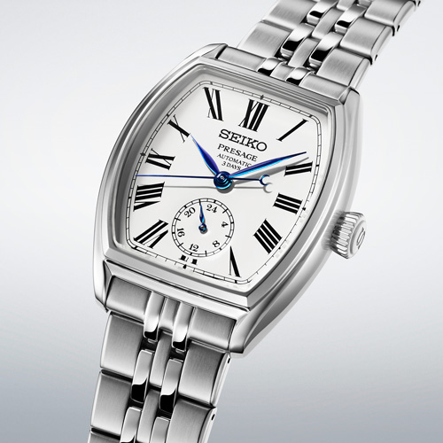 本作は、日本の伝統工芸であり、職人の高度な技術によって生み出された琺瑯ダイヤルのモデルです。そして、日本の美意識を発信するセイコー プレザージュの現行モデルにはないトノー型ケースを採用しました。精工舎が1895年に製造した初の懐中時計「タイムキーパー」を讃えて、ダイヤルにはその特徴的なデザインを取り入れています。トノー形状に合わせて配置したローマ数字のインデックス、琺瑯ならではの艶やかな立体感を引き立てる24時針のサブダイヤル、レール(線路)のようにデザインしたダイヤル外周の目盛が、クラシカルな印象を際立たせます。また、分針と秒針の先端をダイヤル側に曲げることで目盛との距離を近づけ、時刻の読みやすさを追求しました。