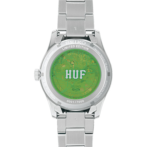 シースルーバック仕様の裏ぶたは、ダイヤルと同じく「HUFグリーン」を採用し、サンフランシスコのシティパターンの線画を入れました。数量限定モデルの証として「LIMITED EDITION」とシリアルナンバーが記されています。