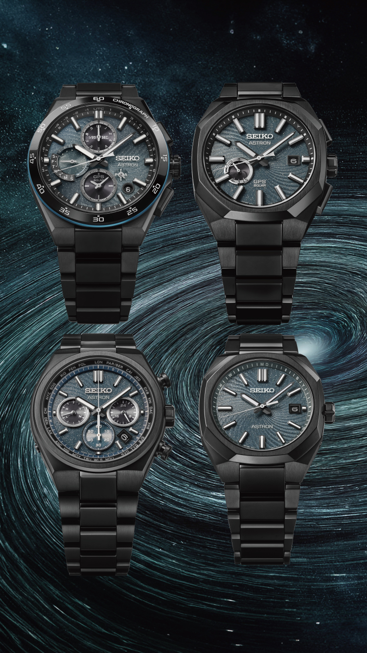 また、漆黒な宇宙の中で、渦巻く銀河が浮かび上がる様を、オールブラックカラーのケース・ブレスレットと、ダークターコイズカラーをベースとしたラメ入りダイヤルが表現しています。