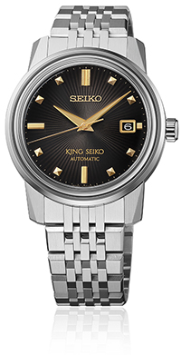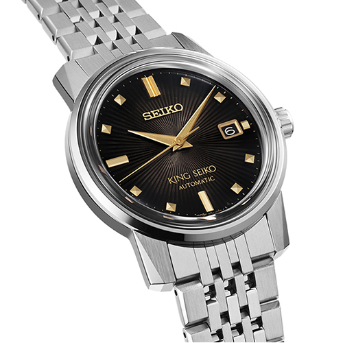 1965年に発売し、キングセイコーのオリジナリティを確立した二代目キングセイコーからインスパイアされ、大胆な多面カットが施されたエッジの際立つケースデザインが特徴であるキングセイコー KSKシリーズに、光をイメージした型打ち文様を施したブラックカラーのダイヤルを採用しました。型打ち文様とゴールドカラーのロゴや針、スタッズのようなピラミッド型のカットの入ったインデックスが響きあうことで、輝きが放射状に美しく広がる特別なデザインです。