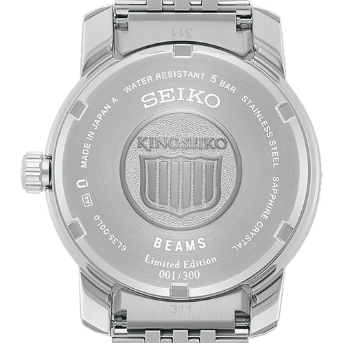 キングセイコーの「盾」をモチーフとしたブランドマークが入った裏蓋には、BEAMS Limited Editionの文字とシリアルナンバーがマーキングされています。ムーブメントは、セイコーの現行機種で最も薄い自動巻ムーブメント「キャリバー6L35」です。