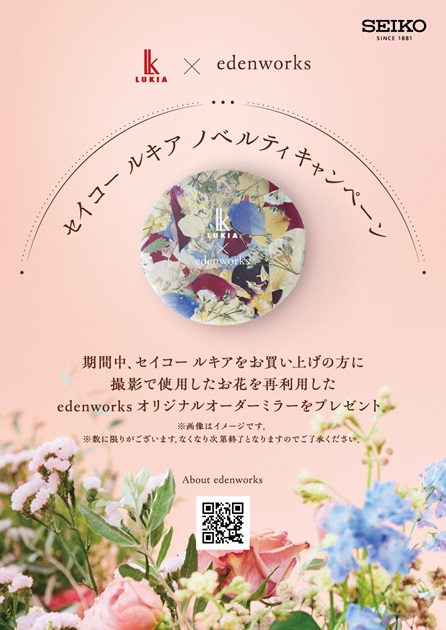 期間中に、ルキアをお買い上げいただいたお客様へ、ビジュアル撮影に使用したお花を活用したedenworks監修のオリジナルオーダーミラーをプレゼントいたします。ミラーは、あしらわれたお花の模様がひとつひとつ異なる、世界に一つだけのデザインです。
