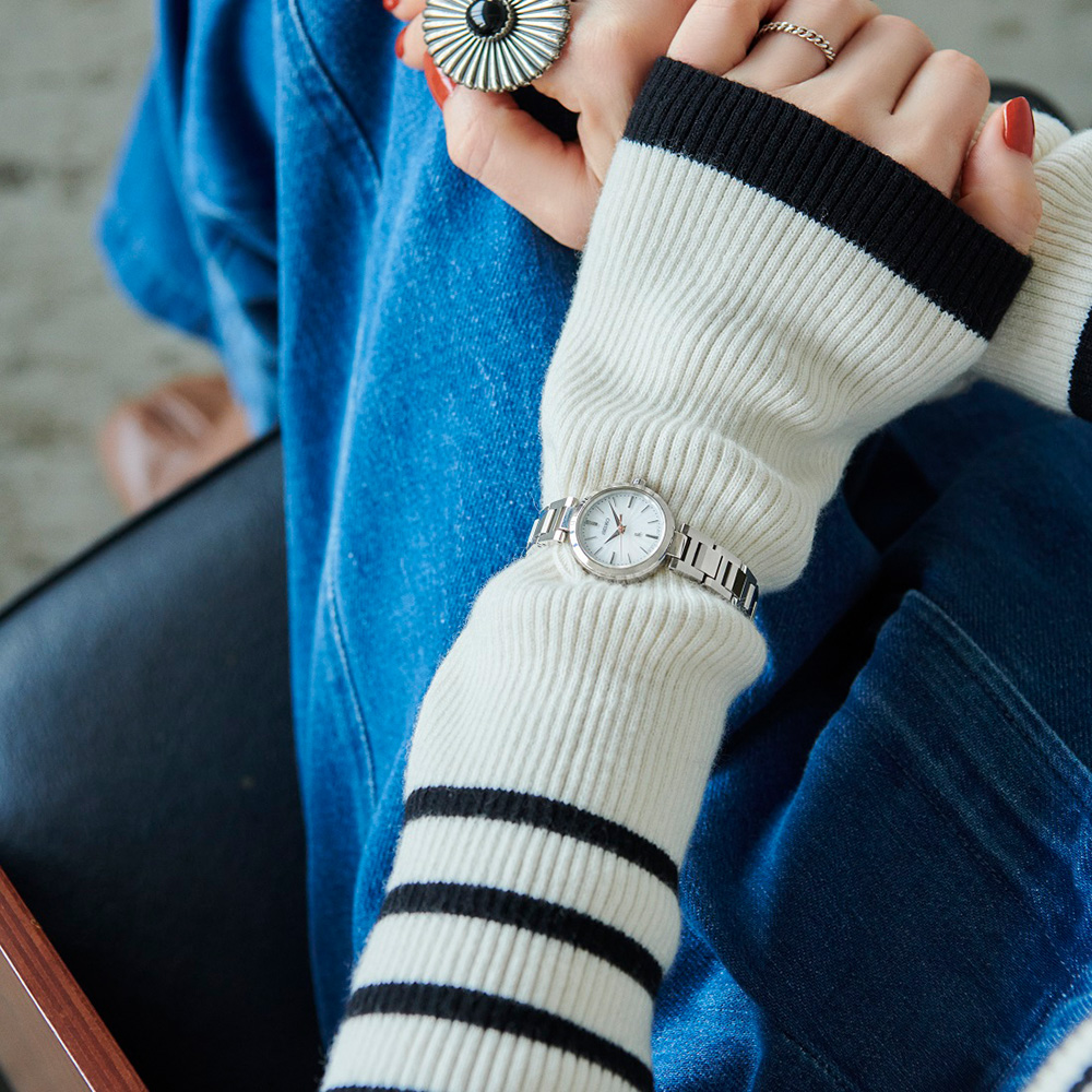 小ぶりなサイズ感でありながらも、 オールシルバーのシャープな輝きを放つブレスレットとの組み合わせで、 甘くなりすぎない存在感のある1本に。 質感の高いシアー感のあるパール調のダイヤルは、 高級感を演出してくれます。