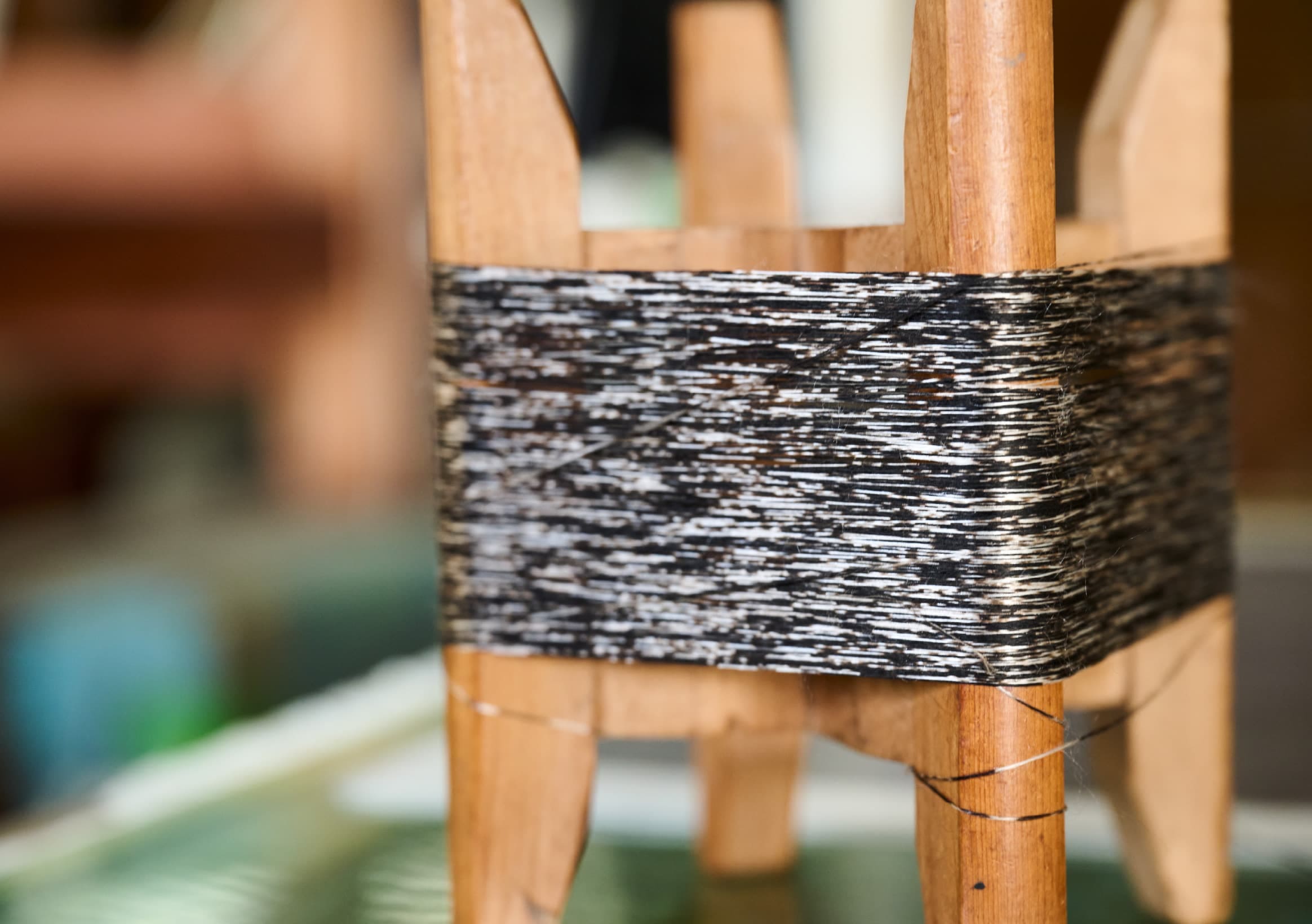 越間:締め機を使用すること、そして約0.3㎜の絹糸を使用することで繊細な模様を表現できます。ただしすべてが手作業なので、織っているうちに模様が少しずれたり動いたりする。だから1本1本丁寧に、模様合わせをしていきます。