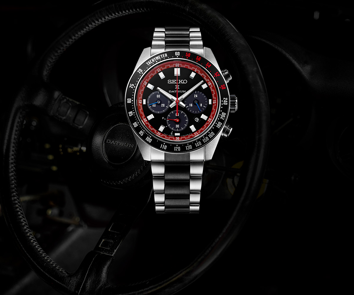 「ダットサン240Z」を象徴するロゴマークを6時位置に配置しました。光の反射を抑えるラリーカーの色から着想を得て、マットブラックをダイヤルに採用しつつ、秒針やダイヤルリングに赤色をアクセントとして加えることで、判読性を向上させています。