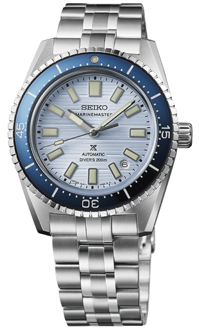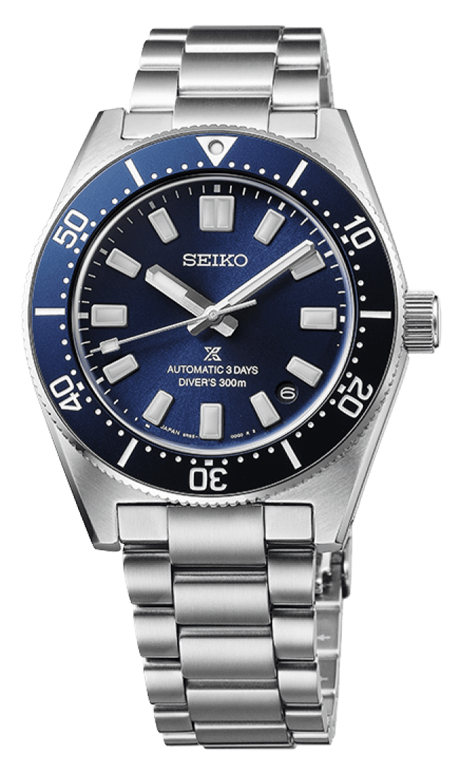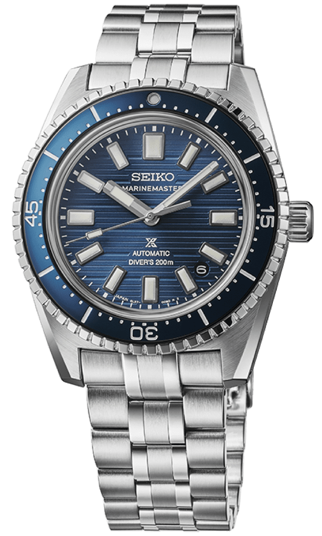 「このきれいなブルーダイヤルに惹かれます。どこか海っぽい感じもしますよね(坂口)」。セイコー プロスペックス マリンマスター ダイバーズ 1965 ヘリテージ「SBEN007」セイコーウオッチサロン専用モデル。自動巻、SSケース、200m空気潜水用防水、ケース径39.5㎜、ケース厚12.3㎜。製品の詳細はこちら ≫