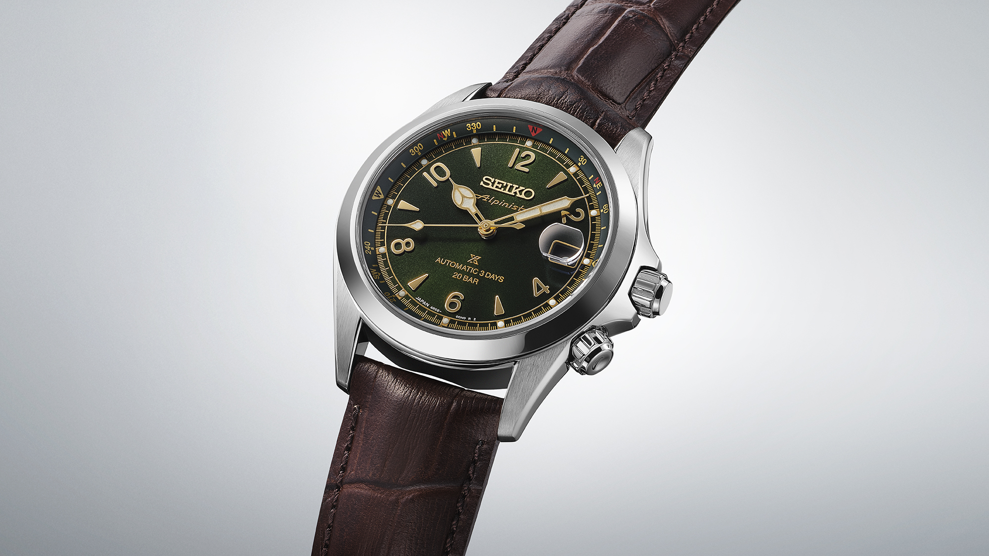 1959年に誕生した初代ローレル アルピニストの伝統を受け継ぎ、「Alpinist」のロゴデザインをダイヤル12時位置のSeikoロゴの下にレイアウト。ダイヤルカラーには、印象的なグリーンのカラーリングを採用しています。裏ぶたには、山脈をモチーフにしたマークをあしらい、アルピニストならではの世界観を際立たせています。