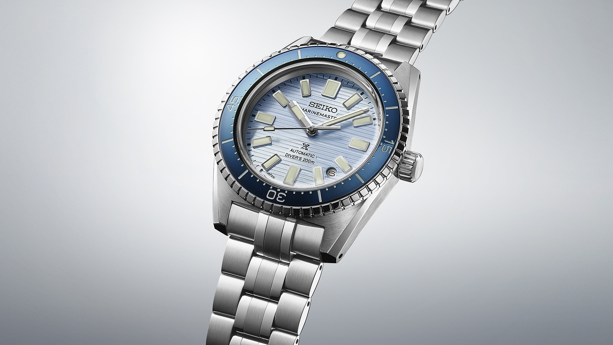 「1965 メカニカルダイバーズ」の意匠である、時・分・秒針の形状と特徴的な角型インデックスを受け継ぐとともに、ケースやブレスレットに美しいヘアライン仕上げと鏡面仕上げを施すことで、洗練された雰囲気を醸し出しています。またダイヤルパターンには、太い直線と細い直線を組み合わせ、繰り返し打ち寄せる波のリズムを幾何学的模様で表現しました。軽やかなライトブルーのダイヤルとブルーのベゼルを組み合わせています。