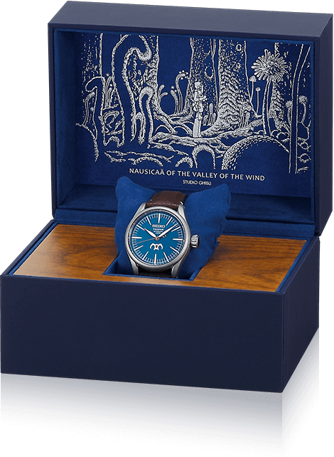 주인공인 나우시카가 착용한 의상을 표현하기 위해 블루 컬러의 에나멜 다이얼로 디자인했습니다. 에나멜 제작을 전문으로 하는 요코사와 미츠루(Yokosawa Mitsuru)의 기술과 세심하게 검사하고, 정밀하게 조정하는 제작과정을 통해 완벽한 푸른색 색상을 구현했습니다. 화이트 컬러의 시침과 분침, 인덱스가 블루 컬러의 다이얼과 대비되어 가독성을 높이고, 골드 컬러의 초침으로 포인트를 주었습니다. 시침과 분침은 둥근 나뭇잎 모양으로 디자인되었고, 길쭉한 모양으로 된 인덱스는 한눈에 시간을 읽기 편하도록 디자인되었습니다. 나우시카가 극 중 입은 의상 중 하나의 엠블럼이 다이얼의 6시 위치에 인쇄되어 있습니다.