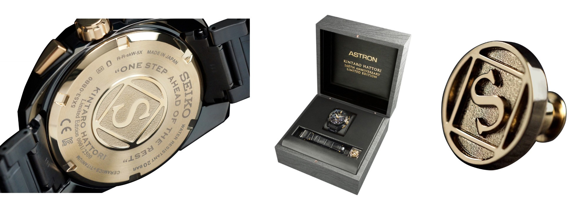 La parte trasera de la caja del Kintaro Hattori 160th Anniversary Limited Edition lleva la marca registrada «S» por Kintaro en 1900 para K. Hattori & Co, hoy Seiko Watch Corporation.
