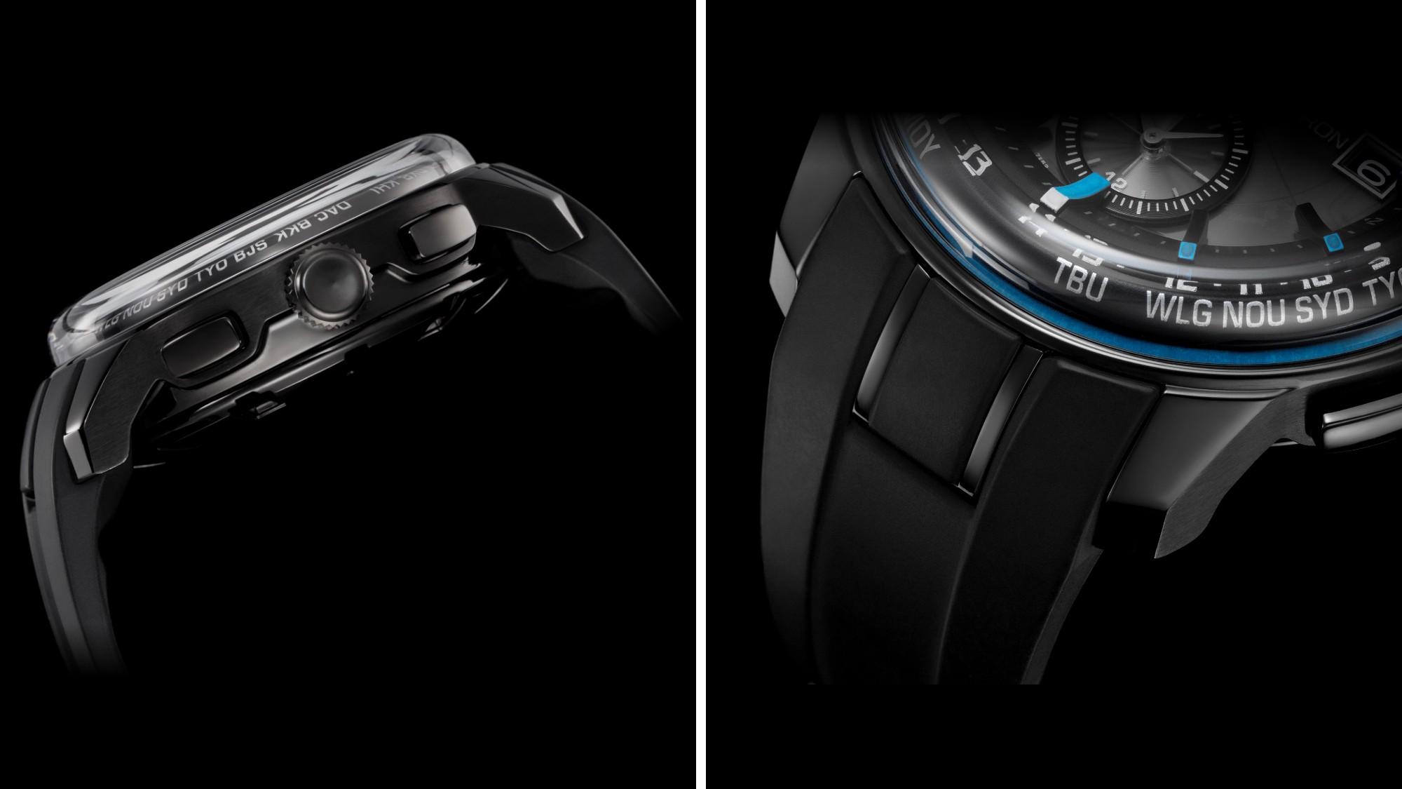Derecha: El bisel de cerámica de 12 facetas del SSE001 muestra claramente los nombres de las ciudades incluso cuando se mira de lado, de modo que la hora se puede leer fácilmente en cualquier lugar del mundo.