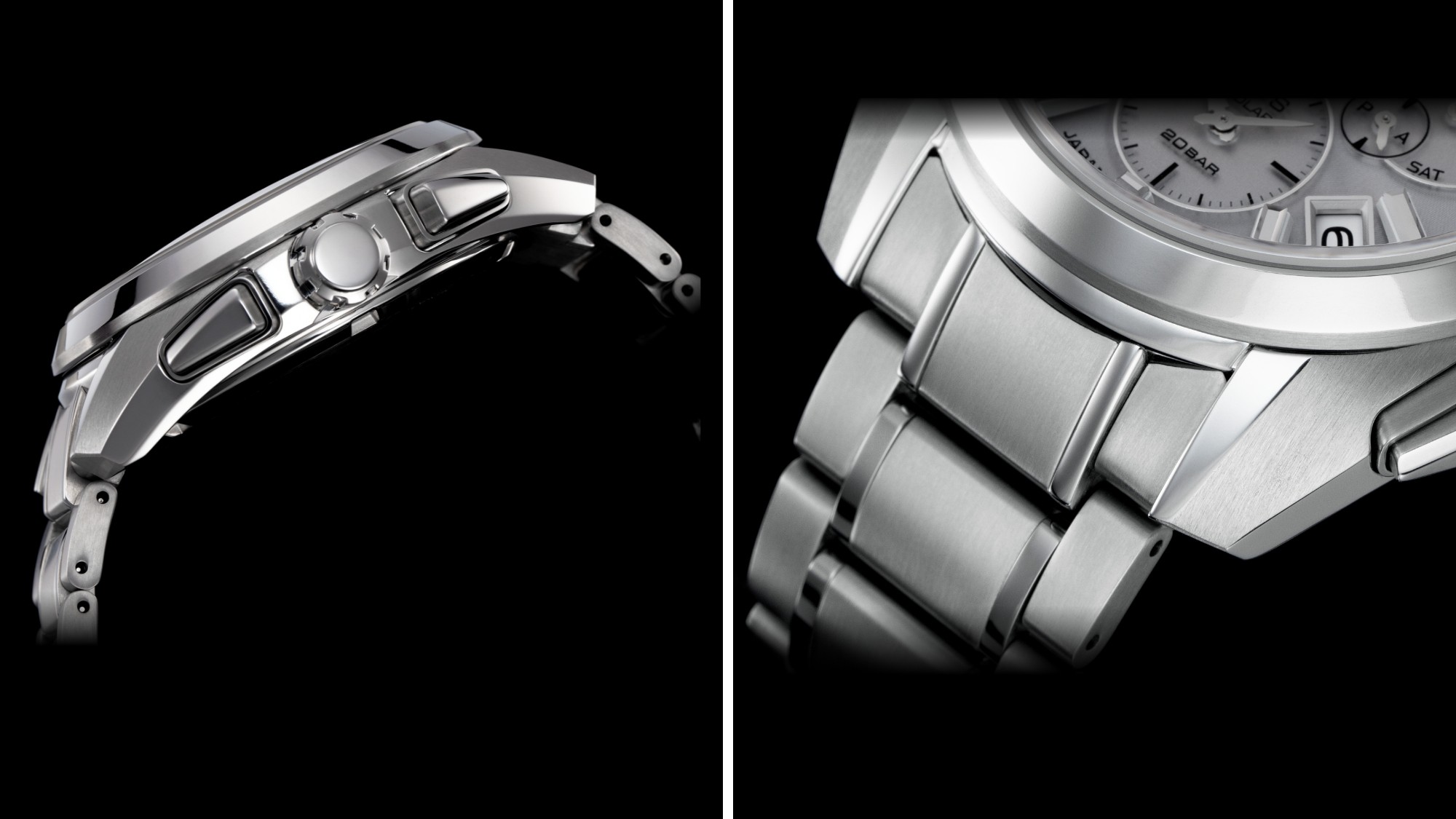 El blanco plateado de la esfera es más brillante que el blanco puro de la serie 8X. Incluso los marcadores de hora de alto brillo tienen el aspecto y la sensación de una calidad total. “Para crear un aspecto tridimensional, colocamos intencionadamente los marcadores de hora en ángulo en lugar de nivelarlos con la esfera. Controlar el ángulo de colocación de algo tan pequeño es más difícil de lo que parece”. Se eliminó la antena de anillo para que el espacio entre la esfera y el cristal ya no se diferenciara del de un reloj de pulsera normal. En su lugar, el diseñador se enfrentó al nuevo desafío de equilibrar la belleza universal de un reloj de pulsera con la identidad de Seiko Astron. El contorno, con la caja en forma de cojín y el lado de la caja de un solo radio, recuerda al Quartz Astron original de 1969. “Al desarrollar la serie 5X, decidimos promover una vez más la singularidad del Astron original”.