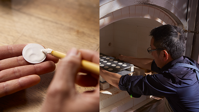 The dials are dried and then fired for the first time at 1,300 degrees to harden and whiten the material.