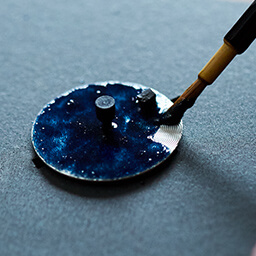 Hand-painting layer after layer of glaze onto the dial, Totani-san won't be satisfied until the enamel is perfectly even, the surface perfectly smooth, and the beauty of the pattern beneath fully revealed. For environmental reasons the glaze contains no lead, which is traditionally used to prevent bubbling. Totani-san must therefore use a microscope to evaluate the surface, and if a bubble is discovered, he will painstakingly remove it and return the surface to its ideal smoothness. When the dial is complete, he feels joy in its perfection. "Sharing this joy is my greatest satisfaction as a craftsman," he explains. "That is the beauty of Shippo Enamel."