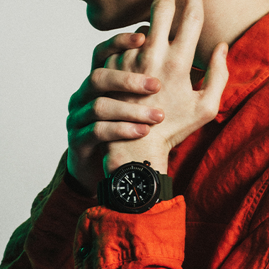 A leather pattern process is applied to a high-strength silicone accordion strap. It is designed to match equally well in town and the great outdoors.