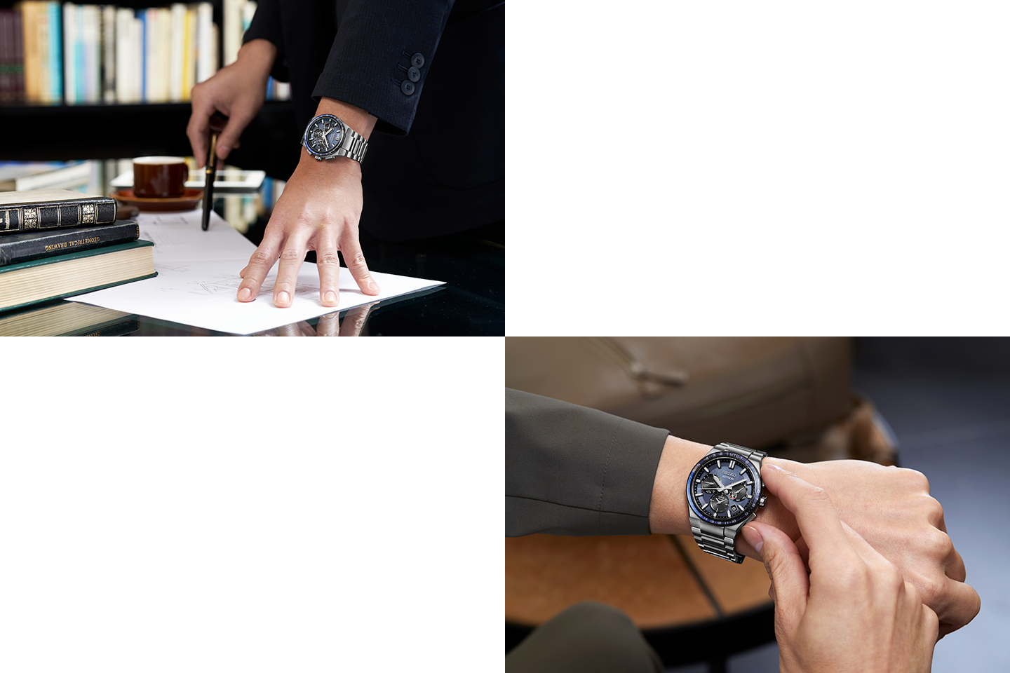 When time zone adjustment is required, all it takes is a simple push of a single button and the hands move faster than ever to the exact local time including Daylight Saving Time, thanks to the system that moves each hand independently. The wearer is also able to change the main time display instantly from home to local time and vice versa.
