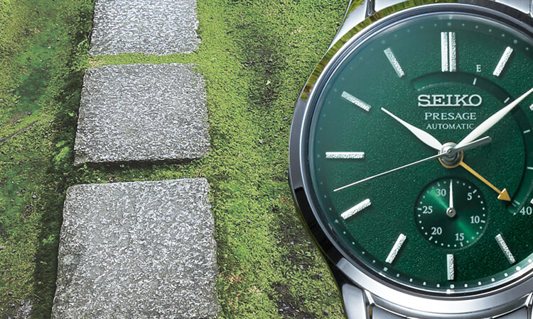 Ogród japoński jest dobrze znanym i podziwianym elementem kultury japońskiej. Stał się inspiracją dla nowej kolekcji Presage. Tarcza ma głęboką i bogatą fakturę przywodzącą na myśl ogród Karesansui lub zen, w którym żwir jest starannie grabiony w spokojne, płynne wzory przypominające fale lub kręgi na wodzie. Głęboko wytłoczony wzór na tarczy tworzy pełne dramatyzmu cienie, podobnie jak bruzdy żwiru w ogrodzie Karesansui.