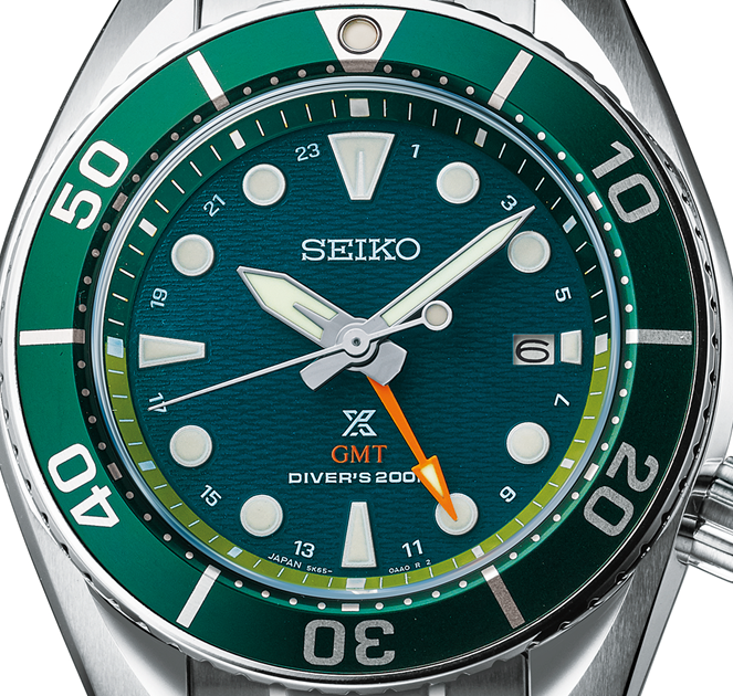 Pierwszy zegarek Seiko zasilany energią słoneczną i wyposażony w funkcję GMT. 24-godzinne wskazówki w jaskrawych kolorach otwierają nowe możliwości w zegarkach do nurkowania Seiko.