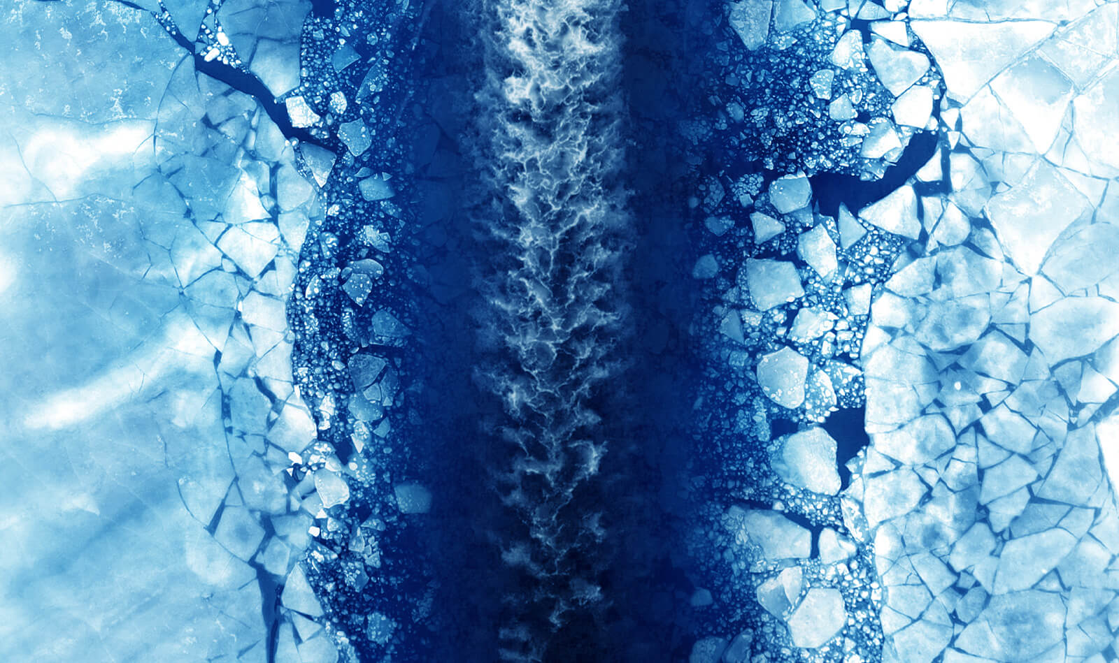 Ta tarcza łączy pionowe niebieskie cieniowanie z teksturowaną powierzchnią wzorowaną na trasie lodołamacza w dryfującym lodzie.