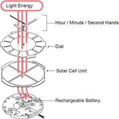 A energia luminosa recebida por uma célula solar (unidade sob o mostrador) é convertida em energia electrónica. A energia é armazenada numa bateria recarregável e usada para alimentar o relógio.