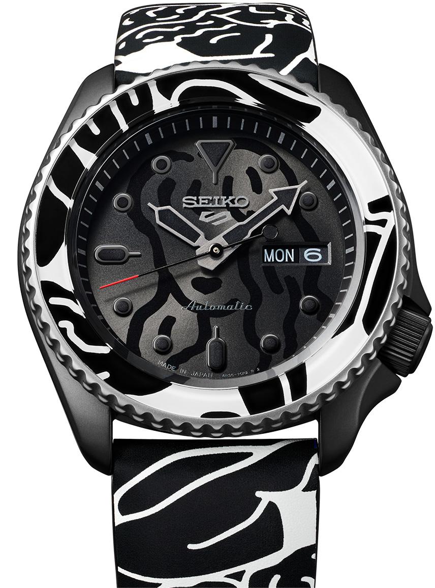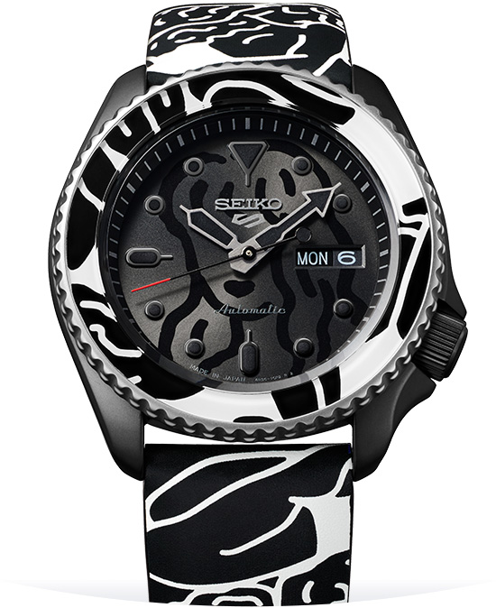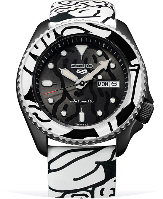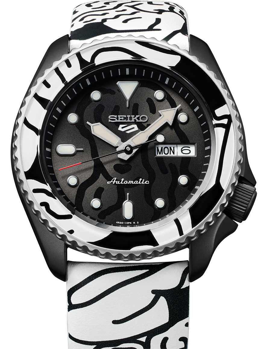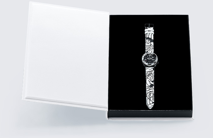 The leather strap is printed with artworks exclusively designed for the collaboration watches.