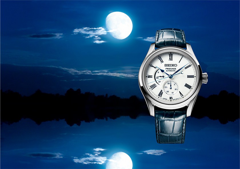 Presage captures the beauty of the moon reflected in water with an Arita porcelain dial.