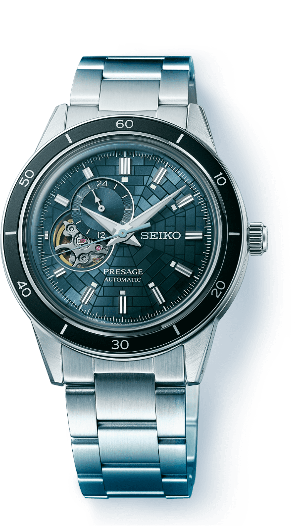 นาฬิกา Presage ได้แรงบันดาลใจจากหินปูพื้นถนนในการสร้างสรรค์ลวดลายบนพื้นหน้าปัด รวมถึงเข็มวินาทีในเฉดสี Komparu เช่นกัน แต่นาฬิการุ่นนี้มีแง่มุมที่โดดเด่นของซีรีส์การออกแบบ “Style60’s” ที่เพิ่งเปิดตัวไป โดยได้แรงบันดาลใจจากนาฬิการุ่น Seiko Crown Chronograph (ไซโก คราวน์ โครโนกราฟ) จากปี 1964 กระจกผนึกเหนือหน้าปัดในแบบยกขอบสูง เข็มชั่วโมงและนาทีเป็นทรงยาวปลายแหลม พร้อมหลักชั่วโมงทรงเหลี่ยม ทั้งหมดถือเป็นเอกลักษณ์ที่ถูกถ่ายทอดโดยตรงจาก Seiko Crown Chronograph และให้ความรู้สึกย้อนยุคที่เข้ากับรูปแบบหน้าปัดสุดคลาสสิกอย่างลงตัว ในตำแหน่ง 9 นาฬิกาเจาะช่องเปิดให้ผู้สวมใส่ได้ชมและเพลิดเพลินกับการทำงานของชุดเอสเคปเม้นท์ และหน้าปัดย่อยแสดงเวลา 24 ชั่วโมงด้านบน ให้การอ่านค่าที่แตกต่างและมีประโยชน์จากเวลากลางวันและกลางคืน