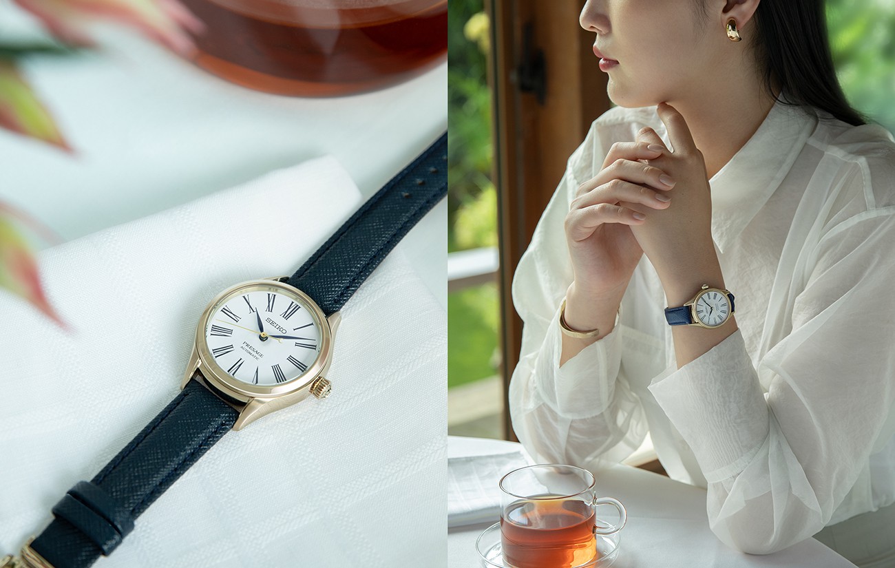 One of the other two designs features a completely new cherry blossom color enamel dial on which the indexes are in brown. The second has a classic white enamel dial with elegant deep blue hands and indexes.