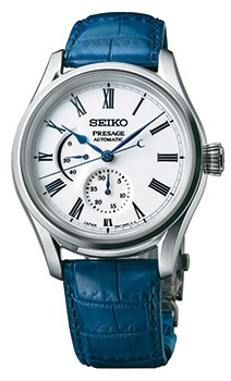 This limited edition watch carries Seiko’s high performance Caliber 6R27. Its 28,800 vibrations per hour can be seen and enjoyed through the exhibition case back. The crystal is a dual-curved sapphire that delivers high legibility from any angle. The watch is 10 bar water resistant and is presented on a crocodile strap with a blue tone that echoes the color of lakes and ponds illuminated by moonlight. The sub-dial at six o’clock shows the date and the one at nine o’clock, the power reserve in hours.
