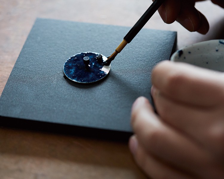 Hand-painting layer after layer of glaze onto the dial, Totani-san won't be satisfied until the enamel is perfectly even, the surface perfectly smooth, and the beauty of the pattern beneath fully revealed. For environmental reasons the glaze contains no lead, which is traditionally used to prevent bubbling. Totani-san must therefore use a microscope to evaluate the surface, and if a bubble is discovered, he will painstakingly remove it and return the surface to its ideal smoothness. When the dial is complete, he feels joy in its perfection. "Sharing this joy is my greatest satisfaction as a craftsman," he explains. "That is the beauty of Shippo Enamel."